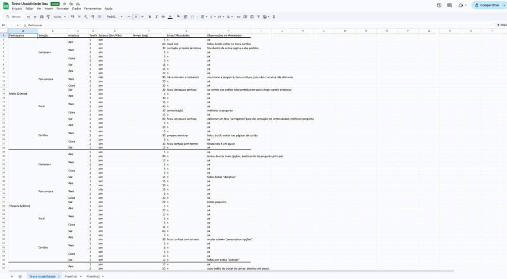 Apesar dessas dificuldades, todos conseguiram completar as tarefas após pequenos ajustes de tentativa e erro, mostrando um bom equilíbrio entre curva de aprendizado e autonomia do usuário. A resposta emocional foi positiva: os participantes relataram maior confiança ao explorar o protótipo e destacaram a relevância de soluções como o Itaú Compras+ e o Ita.ai para tornar a experiência mais fluida.