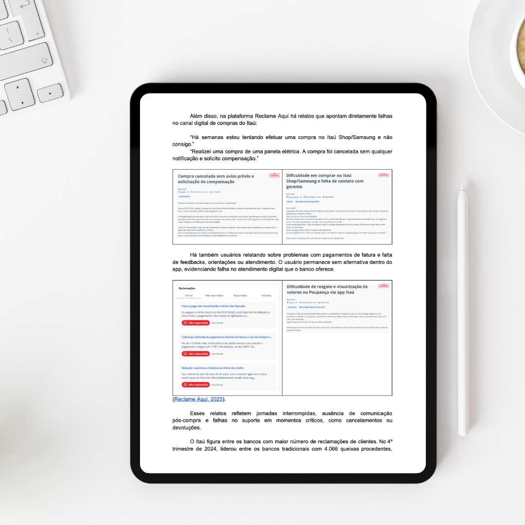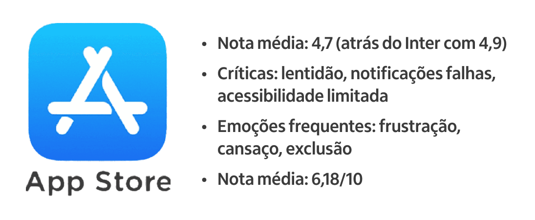Análises em Reclame Aqui, App Store e redes sociais mostram padrões recorrentes: frustração com suporte ineficaz, navegação confusa e ausência de notificações essenciais. Esses problemas minam a confiança e desgastam a relação com a marca.