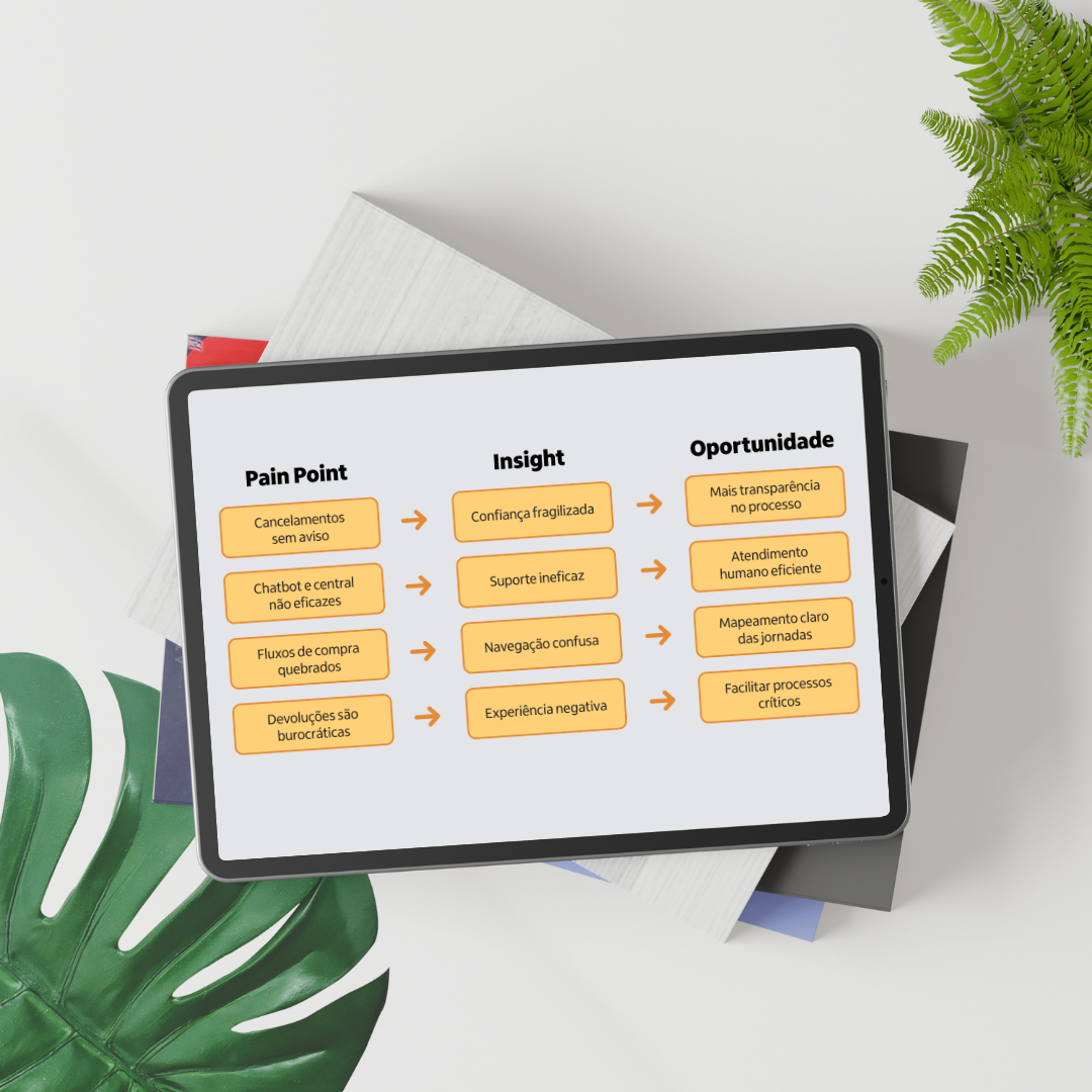 O ponto de partida foi compreender como os clientes realmente se sentem em relação ao banco. Para isso, analisei relatos em plataformas como Reclame Aqui, App Store e redes sociais, identificando dores recorrentes: instabilidade do app, cancelamentos sem aviso, ausência de notificações e suporte ineficaz. Essa escuta ativa permitiu transformar opiniões dispersas em insumos estratégicos para o design.