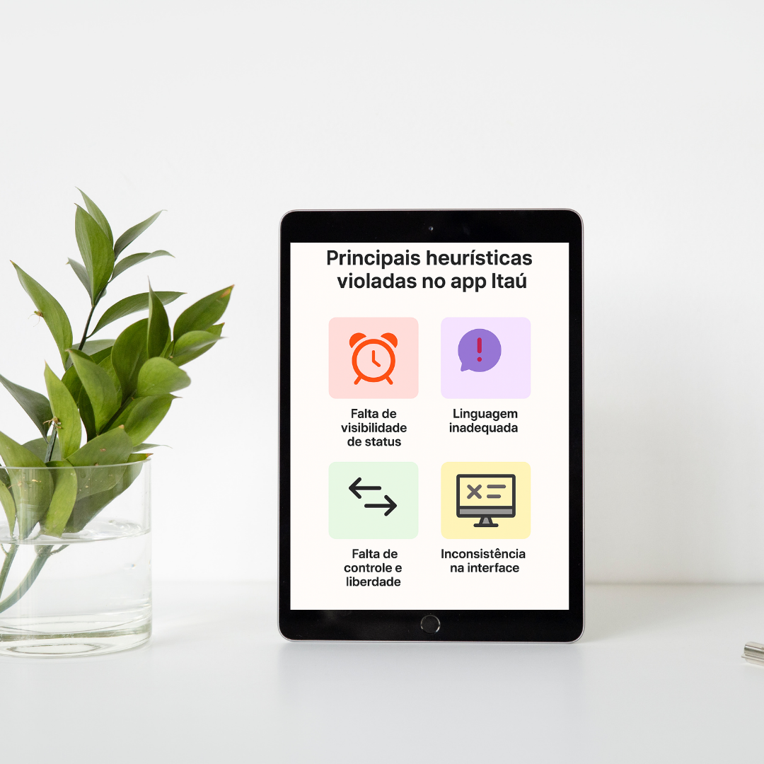 Além dos relatos dos usuários, realizei uma avaliação heurística do aplicativo Itaú com base nos princípios de Nielsen. Essa análise revelou falhas de usabilidade que comprometiam a experiência: linguagem técnica pouco acessível, navegação confusa, ausência de feedback claro em ações críticas e telas poluídas por informações irrelevantes. Esse diagnóstico mostrou como pequenos ajustes poderiam gerar ganhos expressivos de clareza e confiança.