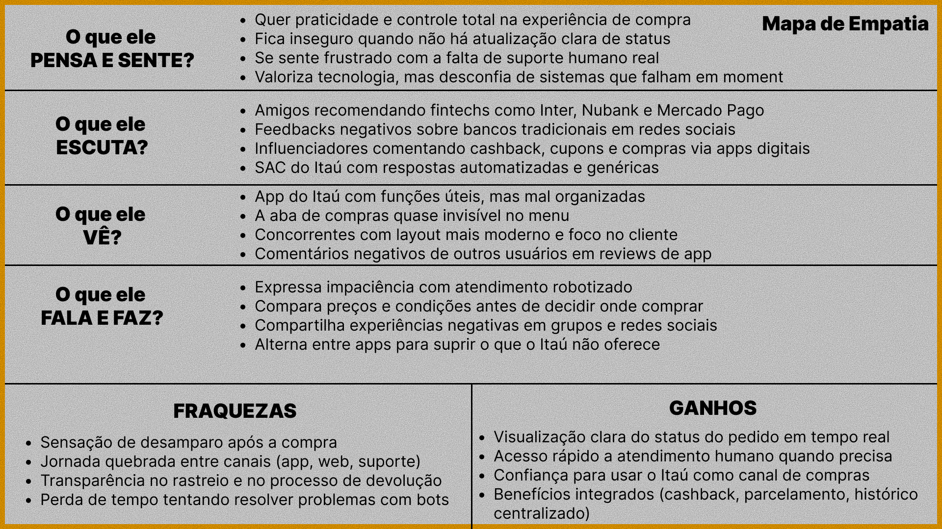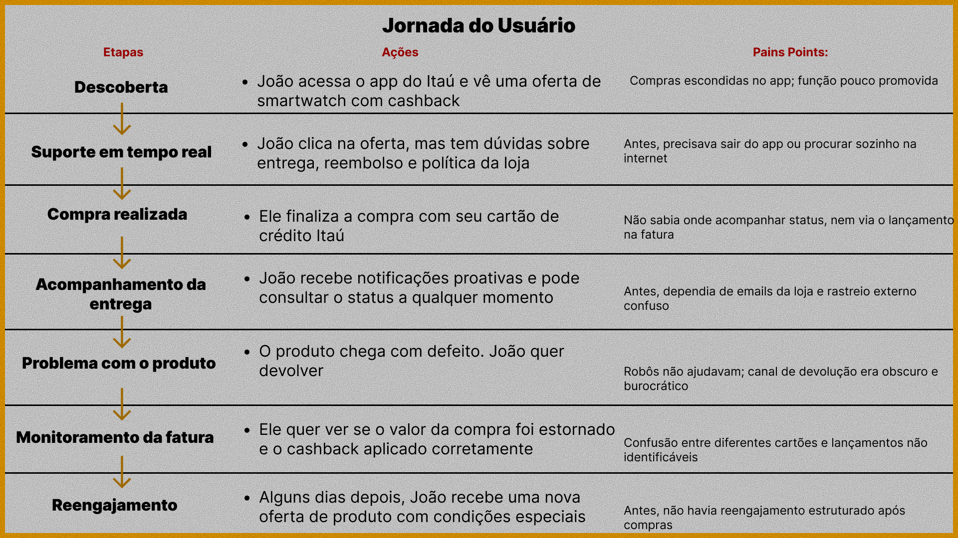 Ao combinar a percepção dos clientes com a análise heurística, emergiu um panorama consistente: a jornada digital carece de transparência, acolhimento e resolutividade. O cliente sente que o banco “desaparece” justamente nos momentos críticos, como compras ou devoluções. Esses insights foram essenciais para direcionar a criação de soluções empáticas, fluidas e integradas, capazes de fortalecer a confiança e a relação com a marca.