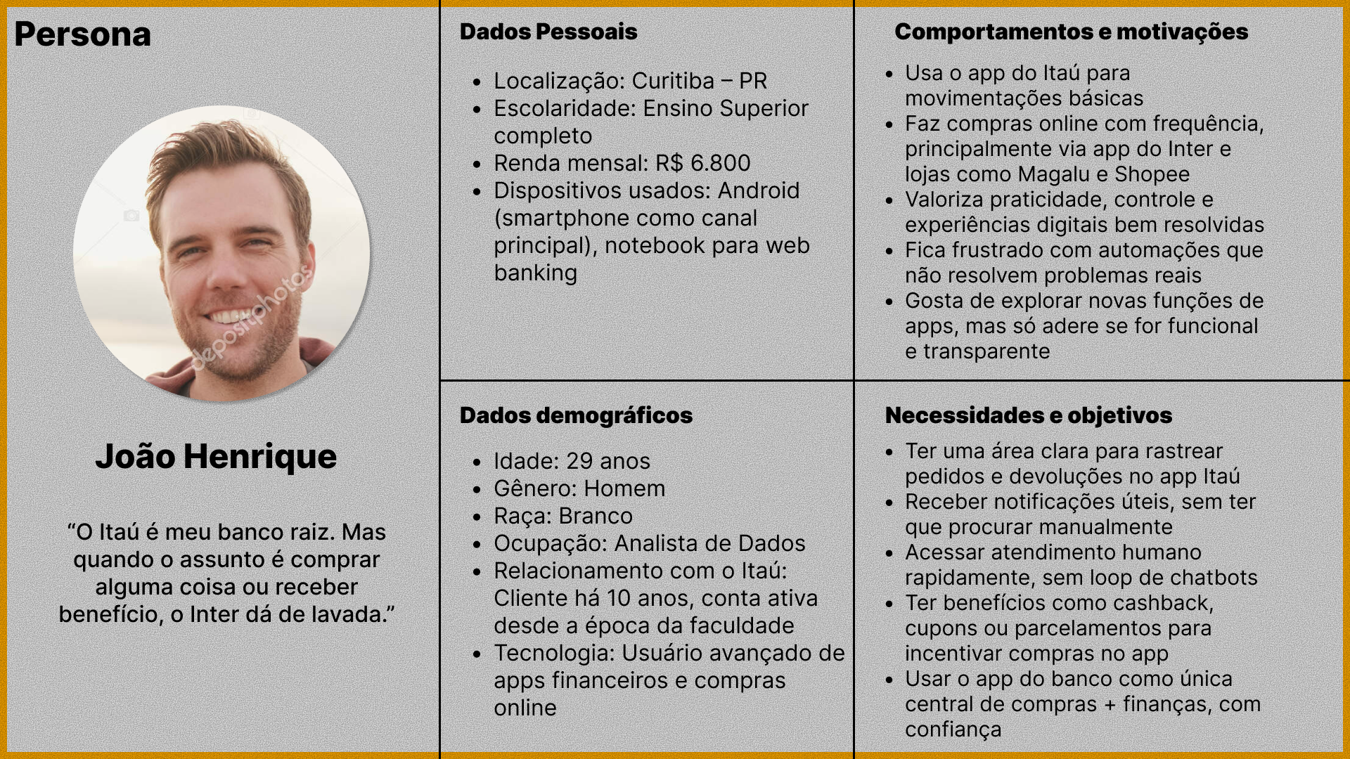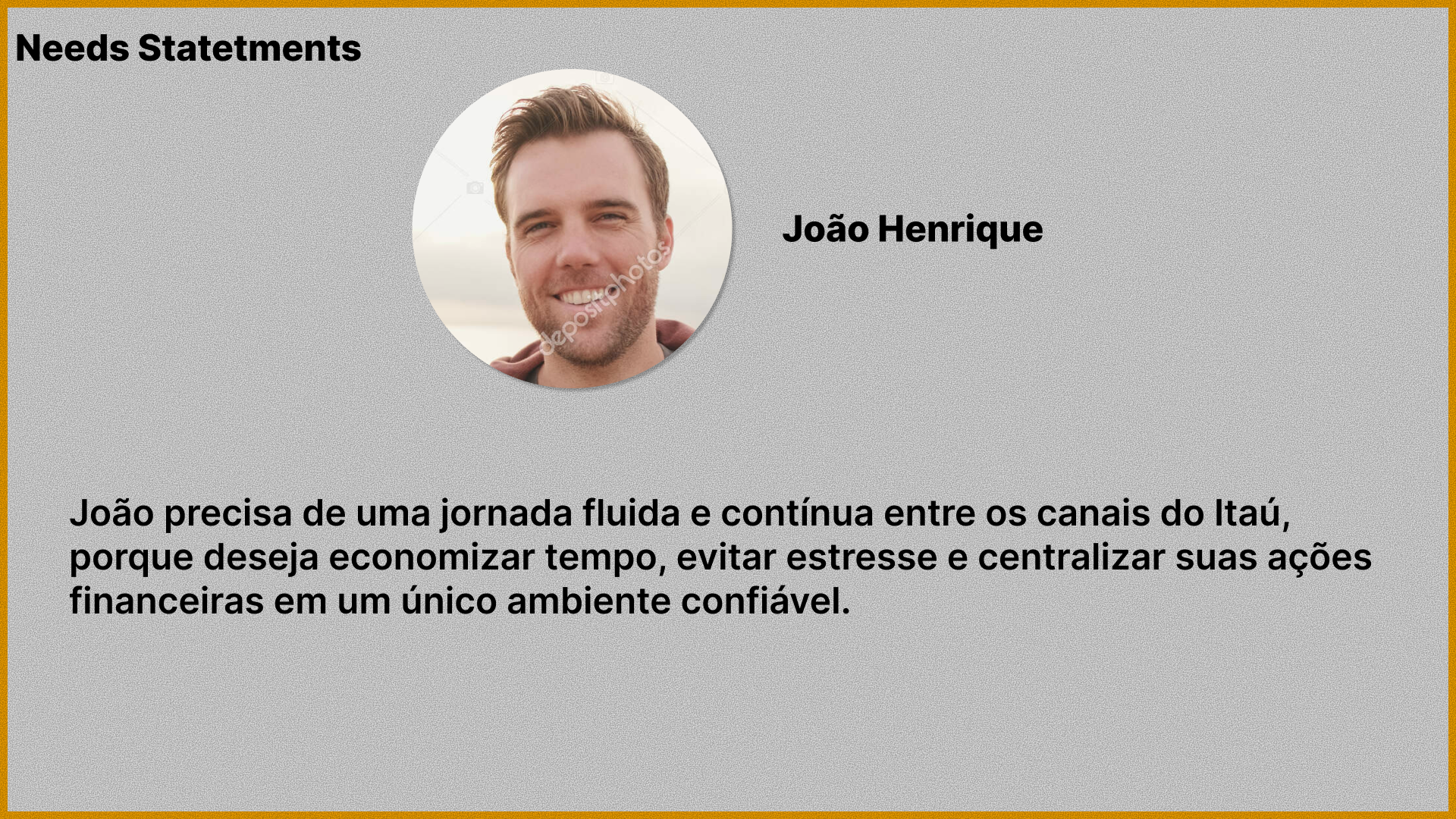 “João precisa de uma jornada fluida e contínua entre os canais do Itaú, porque deseja economizar tempo, evitar estresse e centralizar suas ações financeiras em um único ambiente confiável.”