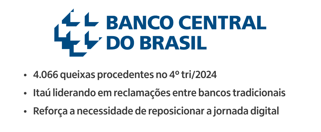 A análise de relatos coletados em Reclame Aqui, App Store e X/Twitter revelou não apenas problemas técnicos, mas também um padrão emocional consistente. As falhas na experiência digital do Itaú vão além da usabilidade: elas impactam diretamente a confiança e a relação do cliente com o banco.