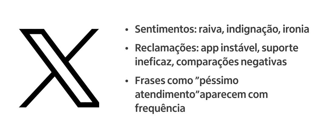 Para compreender os padrões de insatisfação, coletei dados em plataformas como Reclame Aqui, App Store e X/Twitter, com recorte temporal entre janeiro e julho de 2025. Foram analisados indicadores como taxa de resposta, índice de resolução e nota média do consumidor, além de padrões de recorrência em falhas técnicas, atendimento e usabilidade.